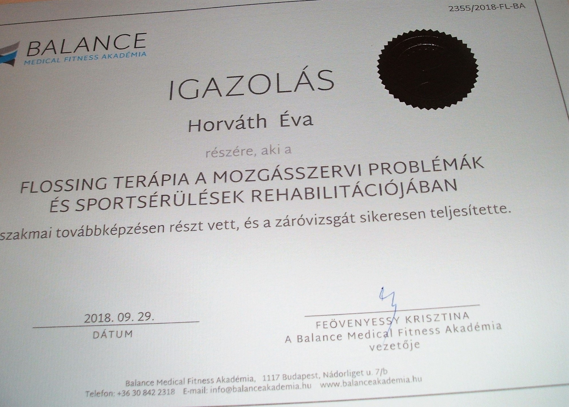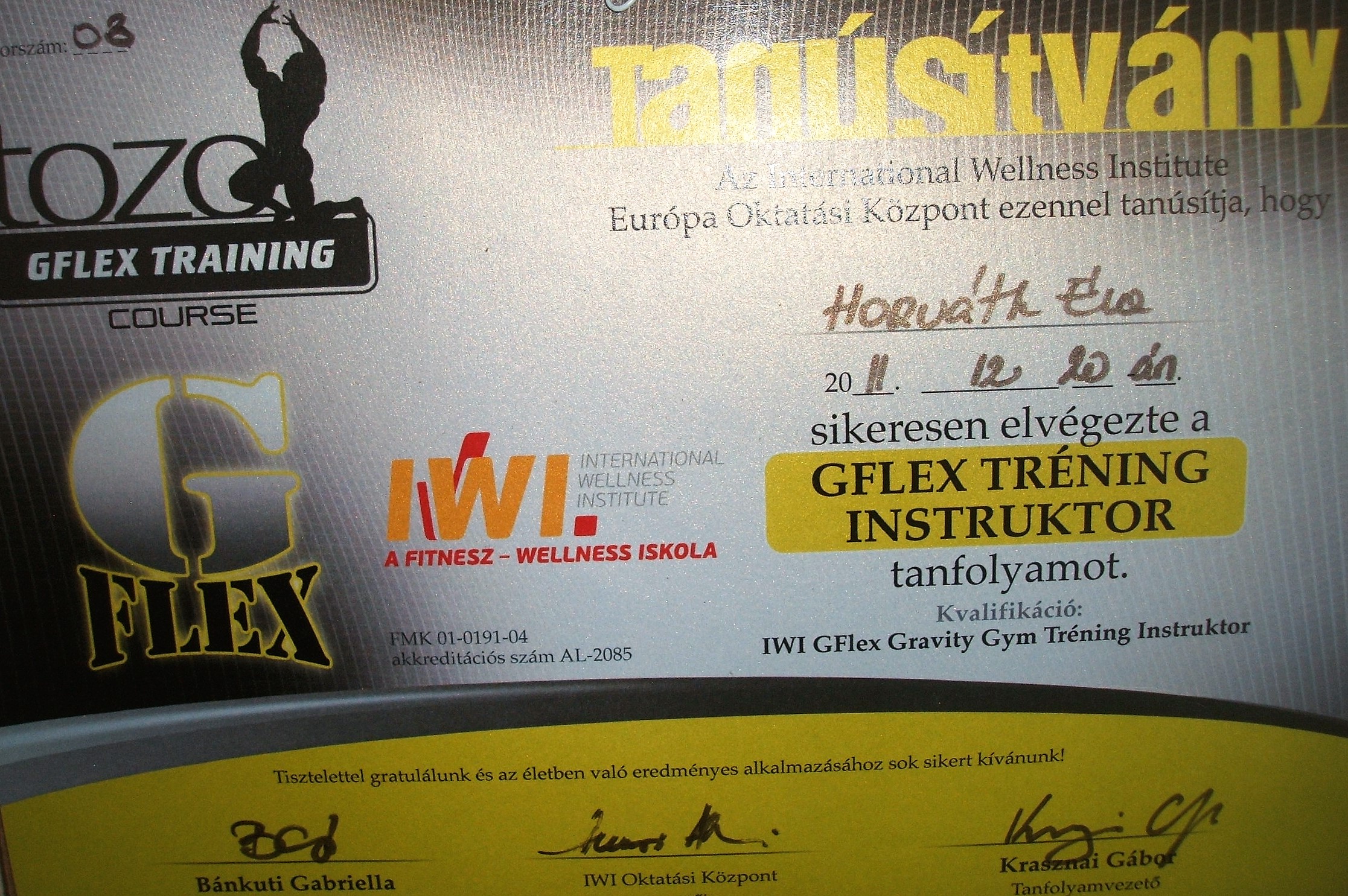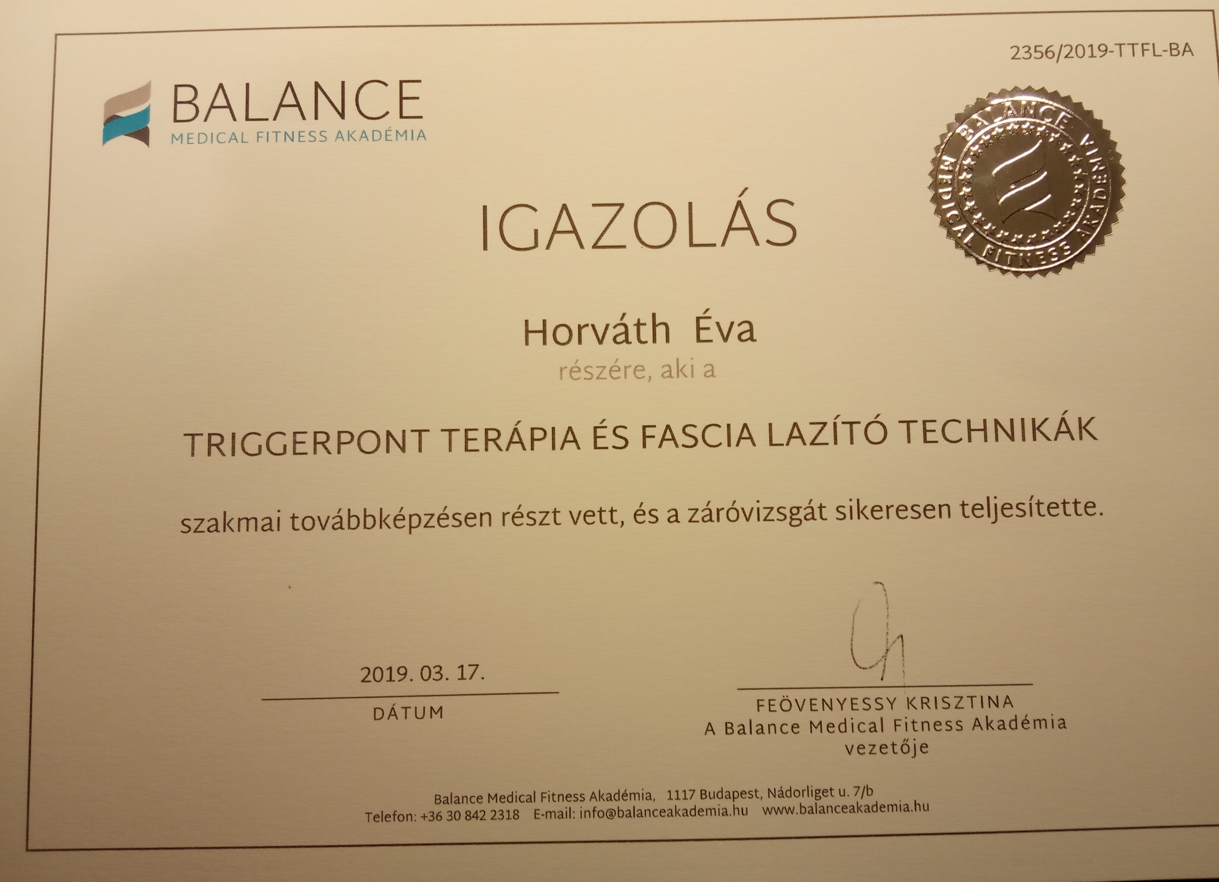 Az évek előre haladtával mindig arra törekedtem, hogy különböző képzéseken vegyek részt. Így számos hazai illetve nemzetközi kongresszuson bővítettem és bővítem szakmai tapasztalataimat köztük a IFAA AEROBIC oktatói, BODY BALL és BOSU egyensúly tréneri tanfolyama is szerepelt, az új funkcionális eszközök a TRX, a GFLEX és a RIP tréneri továbbképzés , illetve egy speciális kompressziós masszázs technika a TRIGGER POINT PERFORMANCE. Legújabb sikeres továbbképzéseim egyike a SPARTAN GIRJA oktatása, a NITA KINESIO TAPING, FLOSSING illetve SVÉDMASSZÁZS, KÖPÖLYÖZÉS, TRADÍCIONÁLIS THAI MASSZÁZS és TRIGGERPONT, FASCIA TERÁPIA alkalmazása akár FASCIA KÉSes technikával az egyéni órák után lazítás, csomó oldás, energetizálás esetében. Lehetőségem volt az USA-ban élni és ott ismerkedtem meg a PILATES szinte minden fajtájával. Az évek során magamon figyeltem meg jótékony hatását ezért döntöttem a STOTT PILATES képzés mellett, melynek teljes körű hitelesített oktatója vagyok. A pilates mellett a YOGA is szerepet kapott az életemben így Indiában töltött időm alatt sikerült az oktatói képesítést is megszereznem.